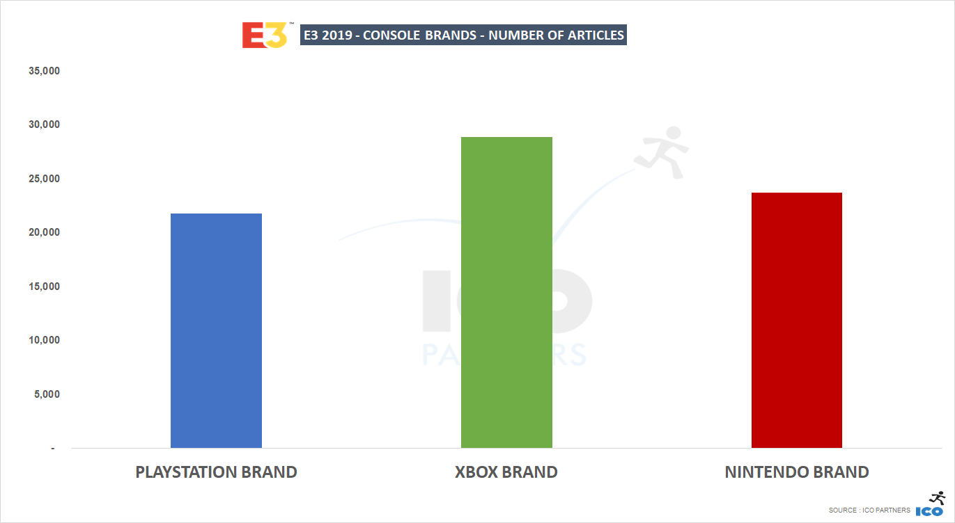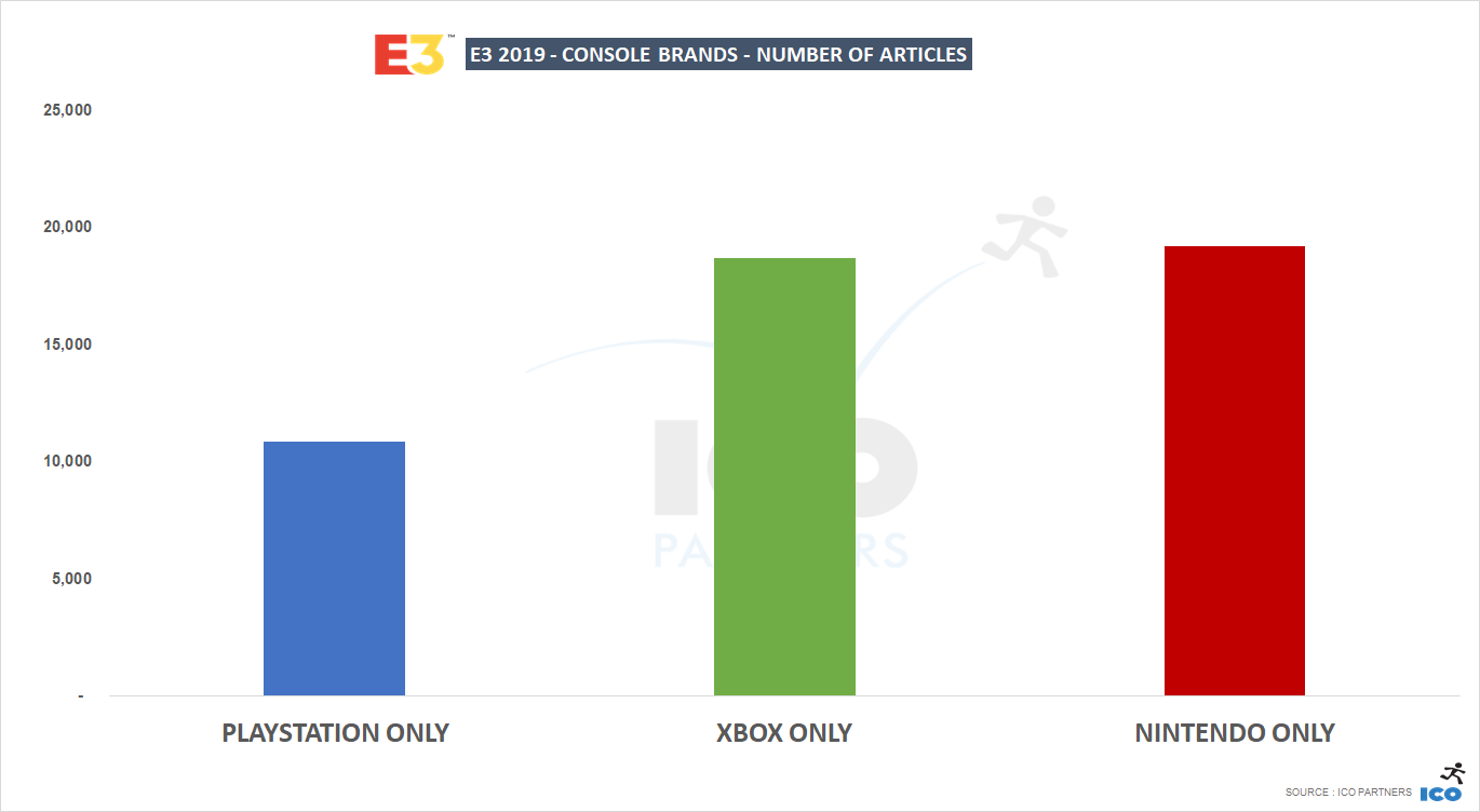 - In spite of their absence Sony still secured a massive amount of coverage, 76% as much as Xbox, given the huge overhead not incurred by attending the show would count this as a win. The logical next step would be for them to set up a strong following for their own events.