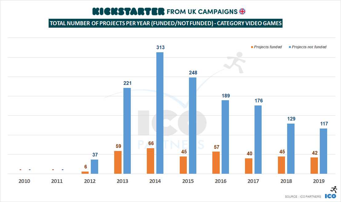 Like on the overall number seen in the 2019 blog post, the number of projects launched on Kickstarter for video games are in constant decline while the number of projects that managed to get funded is relatively stable.