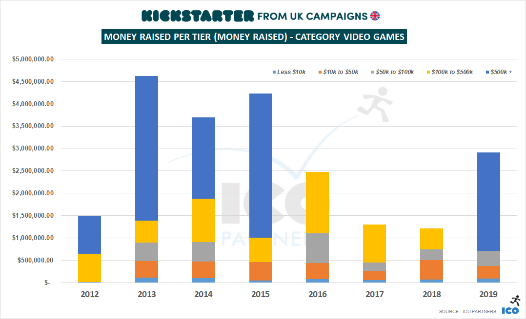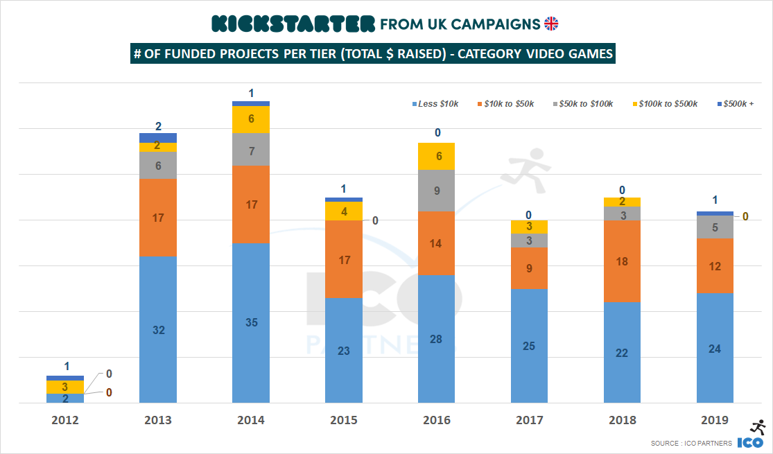 When looking at the UK campaigns by tiers, it becomes very apparent that most of the money raised in 2019 was through the very successful Subverse campaign, with no other campaign raising more than $100,000 last year. And while it skews the results, the low volume of UK projects means that it was also true in the previous years where a single project was more than half of the money raised.