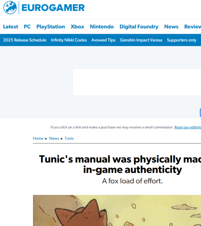 We created a well-received meaningful, and engaging press kit. Recreating the gaming manual from TUNIC alongside a map, pins, notebook, and a hand-made fox finger puppet by various independent makers. Each part had little secrets to discover and language to decipher - including a cryptic puzzle piece.